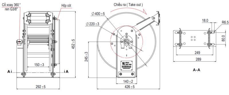 - Vật liệu: Thân rulo được làm bằng thép các bon tiêu chuẩn dầy 3mm + Vành 1mm, dập định hình chắc chắn, vén vành cứng cáp, Thanh đỡ dây nhôm đúc định hình rất cứng cáp. Bộ xoay chống xoắn dây bằng đồng và Inox 304 đảm bảo không bị rỉ sét, chống mài mòn cao đảm bảo không bị rò rỉ.